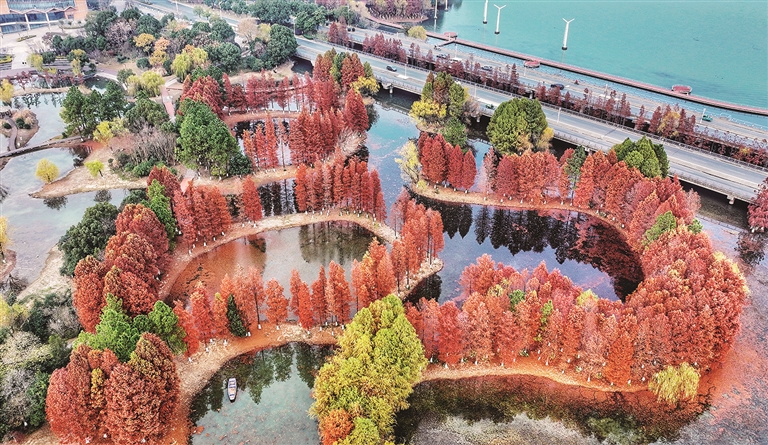 眼下,暨阳湖国家生态公园内水杉色彩斑斓,在冬日暖阳的照耀下,呈现出一幅独具韵味的生态画卷。